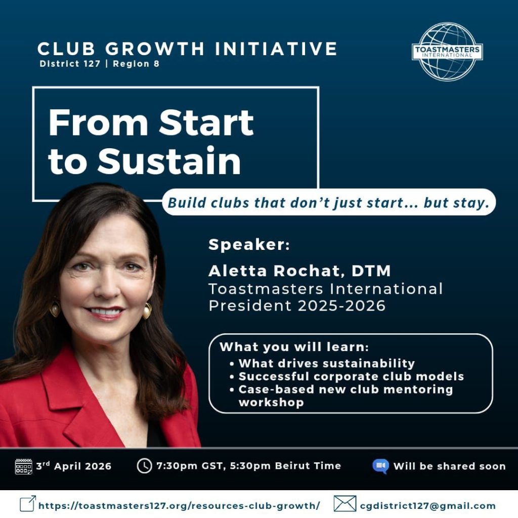 Ever wondered what makes some Toastmasters clubs thrive while others fade away? Here’s your chance to uncover the secret to lasting success! Join us for an empowering District 127 Club Growth Initiative session titled “From Start to Sustain” with none other than Aletta Rochat, DTM Toastmasters International President 2025–2026. 📅 Date: 3rd April 2026🕢 Time: 7:30 PM GST | 5:30 PM Beirut Time📍 Platform: Link will be shared soon What’s in store:• Discover what truly drives club sustainability• Explore successful corporate club models• Participate in a case-based new club mentoring workshop Let’s build clubs that don’t just start – but stay, grow, and inspire! #LeadershipDevelopment #District127#PublicSpeaking #SustainableClubs#ToastmastersInternational#ClubSuccess #MentorshipInAction