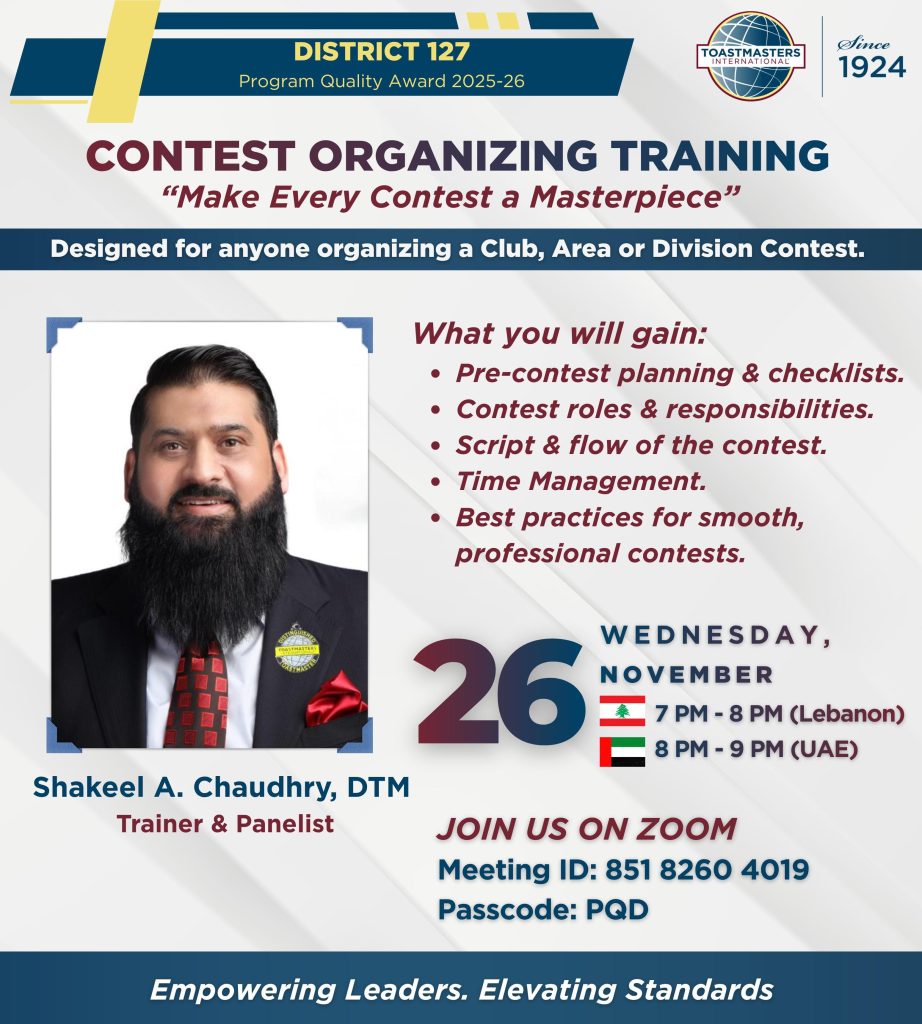 District 127 invites you to an exclusive training session designed to help you plan and conduct professional, high-quality Toastmasters contests with confidence and clarity.