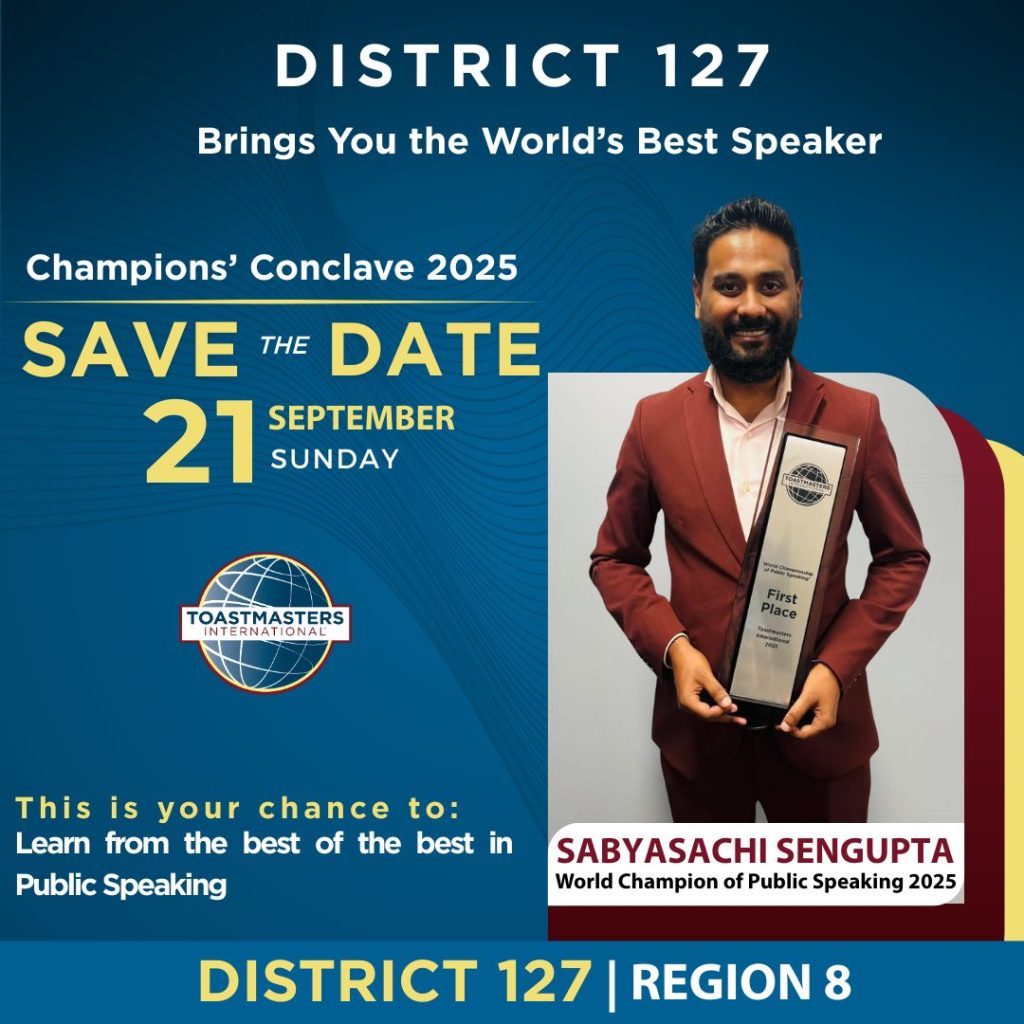 It is with immense excitement that we invite you to District 127’s Champion’s Conclave, a transformative event designed to ignite your leadership potential and sharpen your communication mastery. This year, we are honored to host a truly extraordinary keynote speaker: TM Sabyasachi Sengupta, the recently crowned Toastmasters World Champion of Public Speaking 2025!